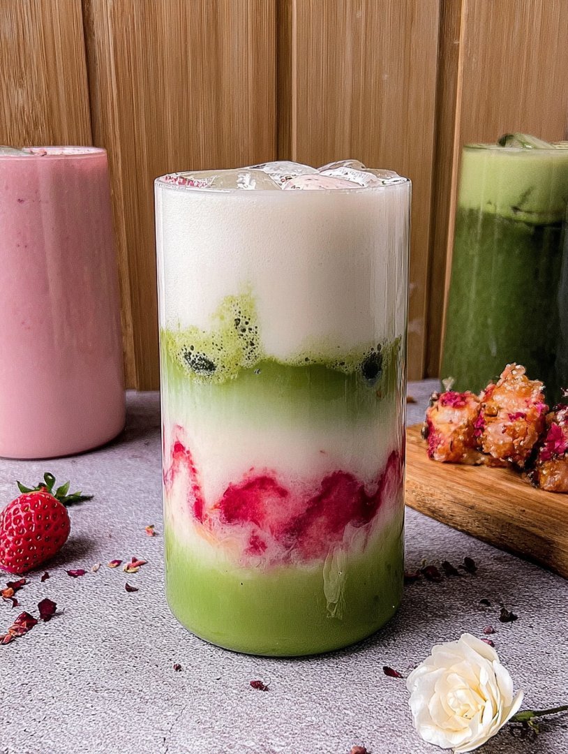 Rezept für einen eisgekühlten Mango-Matcha-Latte – ein erfrischendes Sommergetränk