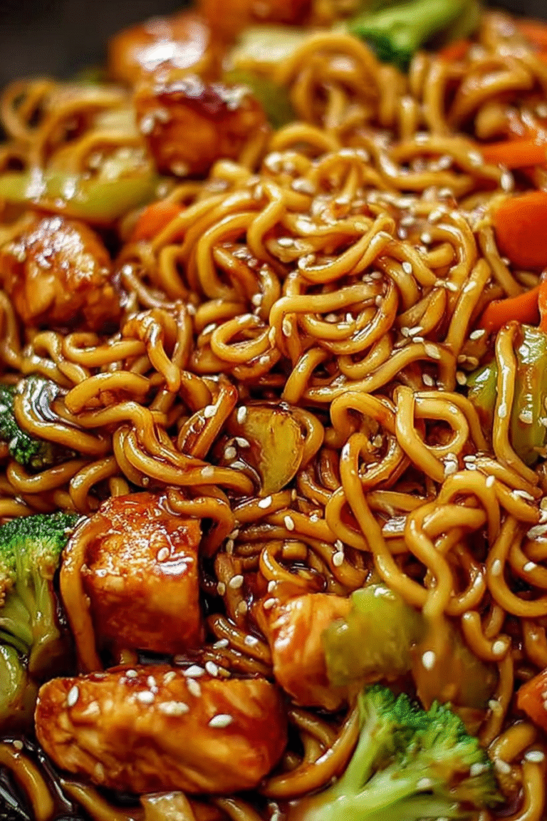 - Ein Augenschmaus: Die glänzenden Nudeln und das goldbraune Hähnchen machen dieses Gericht zu einem Hingucker.