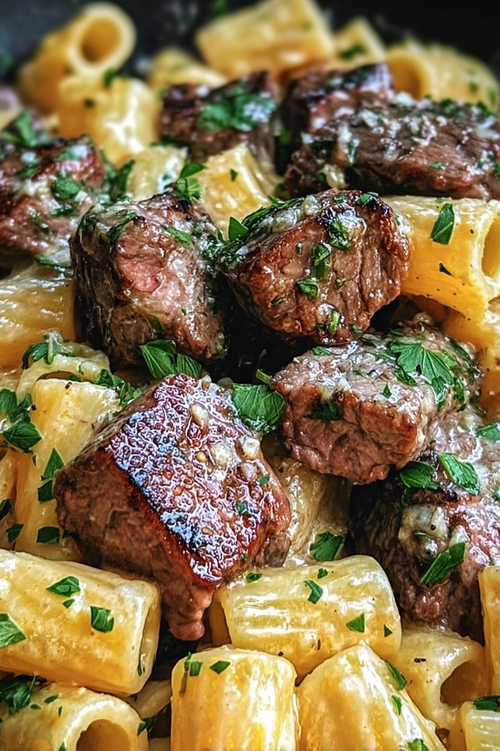 Knoblauchbutter-Steakspitzen mit käsigen Rigatoni genießen