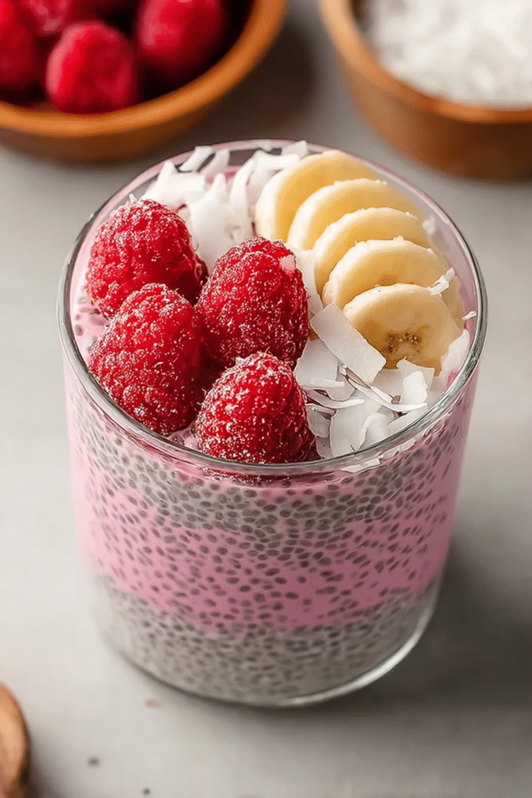 - **Kokos-Himbeer-Chiasamen-Pudding:** Verwendet Kokosmilch anstelle von normaler Milch und fügt etwas Kokosraspeln hinzu.