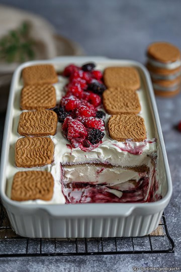 8. **Schichten: ** Lege den Boden einer Auflaufform mit getunkten Spekulatius aus. Verteile die Hälfte der Beeren darauf und gib die Hälfte der Mascarpone-Creme darüber. Wiederhole diesen Vorgang, bis alle Zutaten aufgebraucht sind.