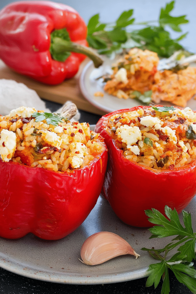 Vegetarisch gefüllte Paprika mit Reis und Feta